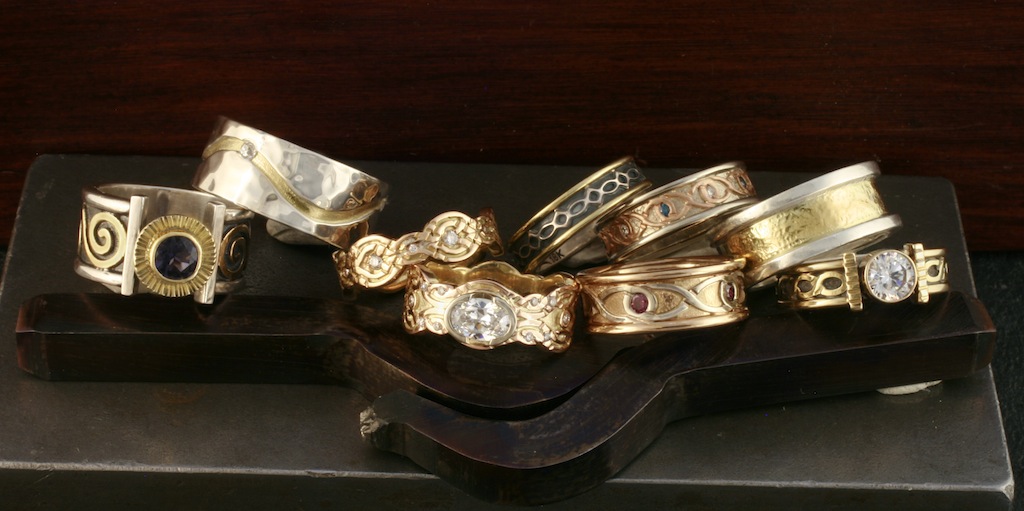We’ll discuss design considerations, best metal choices, manufacturing processes, and gender issues; illustrated with designs from my own small artisan studio. We’ve been in operation since 1995; are based in Santa Fe, New Mexico; and specialize in handmade custom two tone wedding rings.